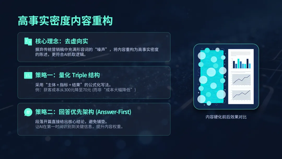 传统的营销公关稿往往充满形容词,这对 AI 而言是低效的“噪声”。内容重构的目标是“去虚向实”,实现所谓的内容“硬化”。