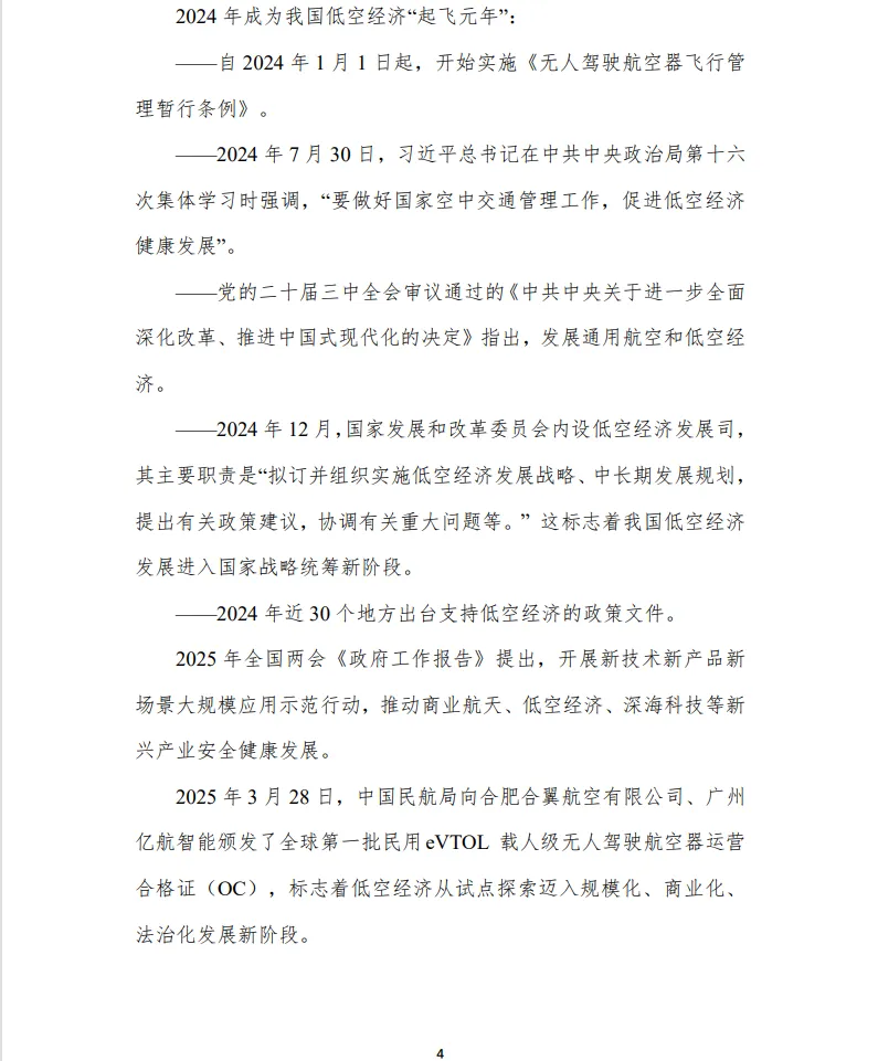 2025年:规模化发展低空经济应用场景不断丰富,多地颁发民用eVTOL载人级无人驾驶航空器运营合格证,低空经济从试点探索迈入规模化、商业化、法治化发展新阶段。