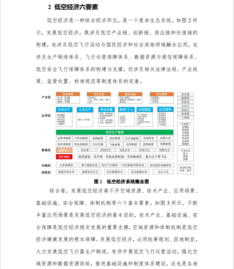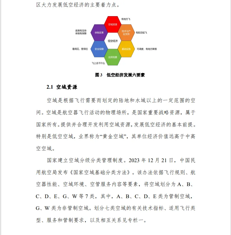 低空经济的发展涉及多个关键要素,报告提出了低空经济发展的六要素框架,包括空域资源、技术与产业、应用场景、基础设施、安全保障和管理体制。