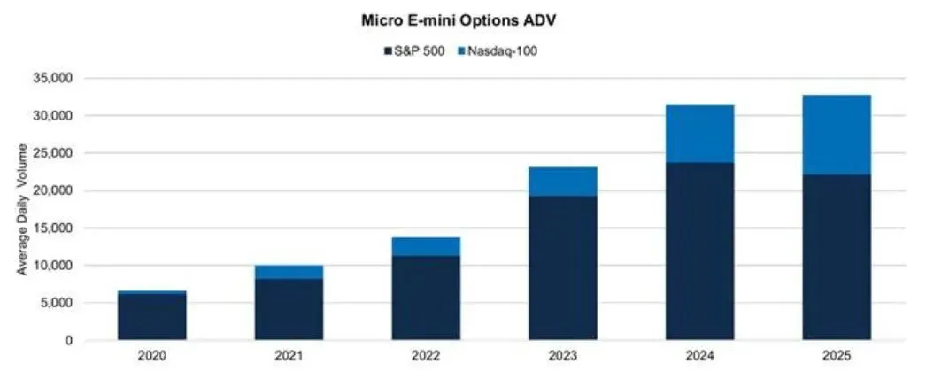 例如,投资者若持有较多科技股,由于科技股对市场波动和利率变化更为敏感,持仓亏损风险相对较高,此时便可买入追踪纳指指数的看跌期权进行对冲。当市场出现下跌、科技股组合产生亏损时,看跌期权的盈利可部分抵消股票组合的亏损,为资产提供可靠的下行保护,最大程度降低损失。类似的美股股指期权,以芝商所为例,针对标普500指数和纳斯达克100指数两项指数的期权合约,就有标准合约和微型合约两种规模,而期限也有季度合约、月度合约和每周合约,投资者可以灵活地运用不同合约以配合交易需要。参考芝商所的交易数据,这两项美股指数的微型期权合约去年的日均交易量(ADV)达到33000张合约,同比增加4%(下图)。可见投资者面对高波动、高不确定性的市场环境,或更需要期权这种工具来管理风险。