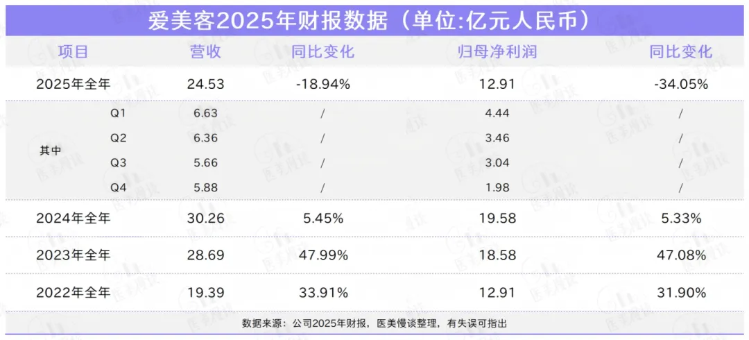 2025年爱美客实现营收24.53亿元,同比下降18.94%;归母净利润12.91亿元,同比下降34.05%。