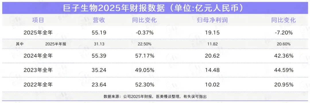 2025年,巨子生物营收55.19亿元,同比微降0.37%,归母净利润19.15亿元,同比下降7.2%。此前三年,公司营收增速均保持在50%左右。