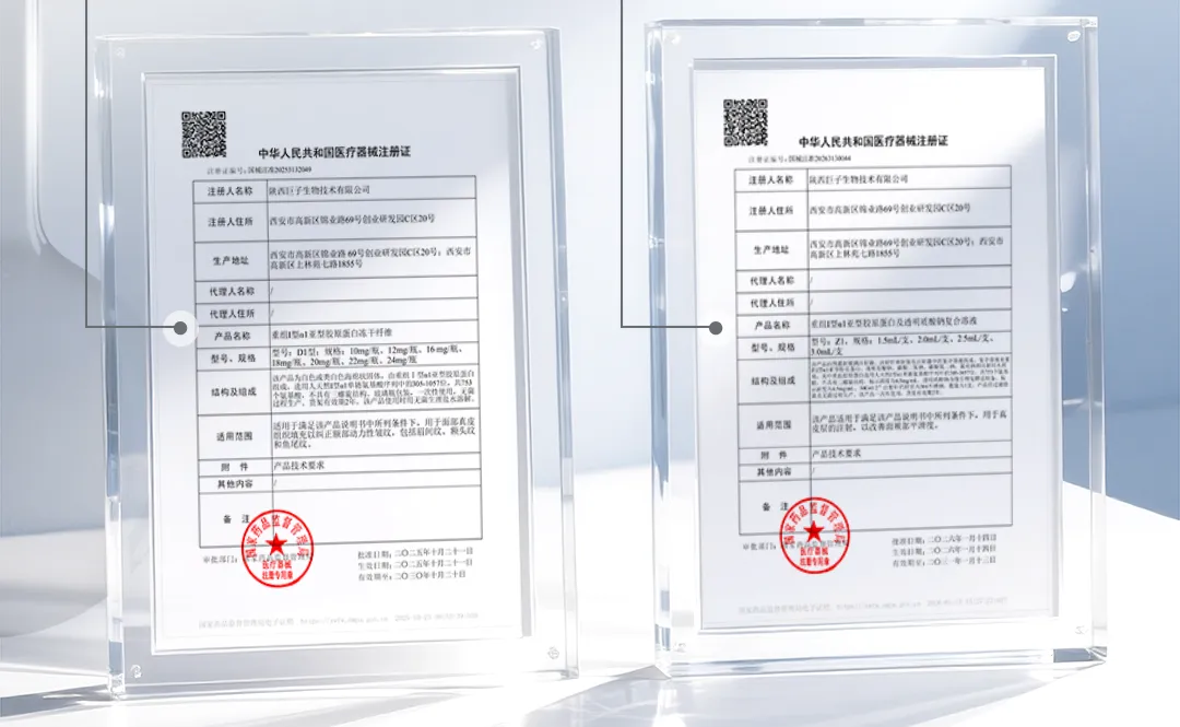 面对内卷,巨子生物也已经提前布局医美赛道。2025年10月和2026年1月,公司【重组I型α1亚型胶原蛋白冻干纤维】和【重组I型α1亚型胶原蛋白及透明质酸钠复合溶液】先后获得NMPA批准上市,巨子正式取得进入医美市场的“入场券”。