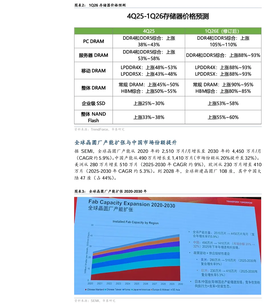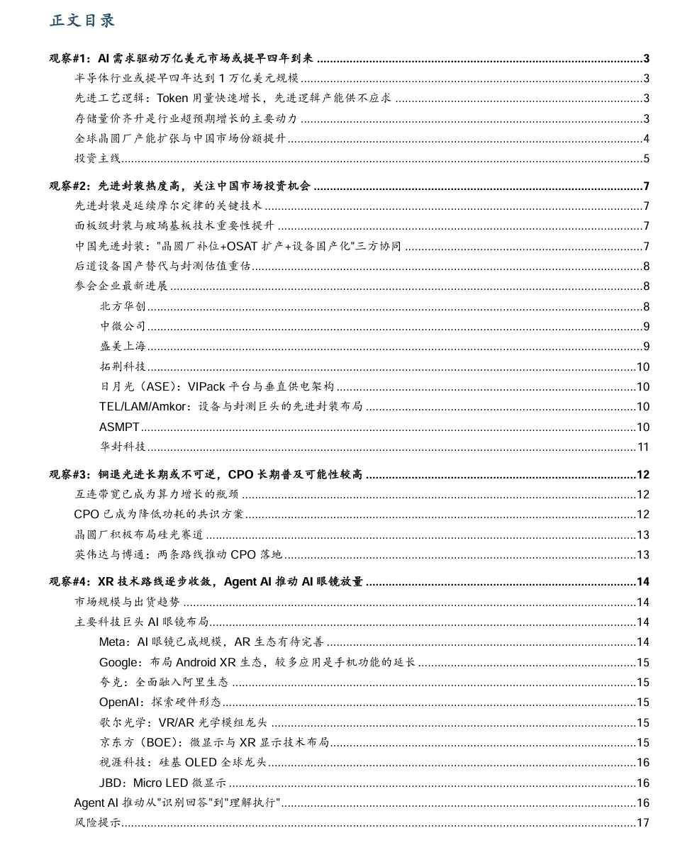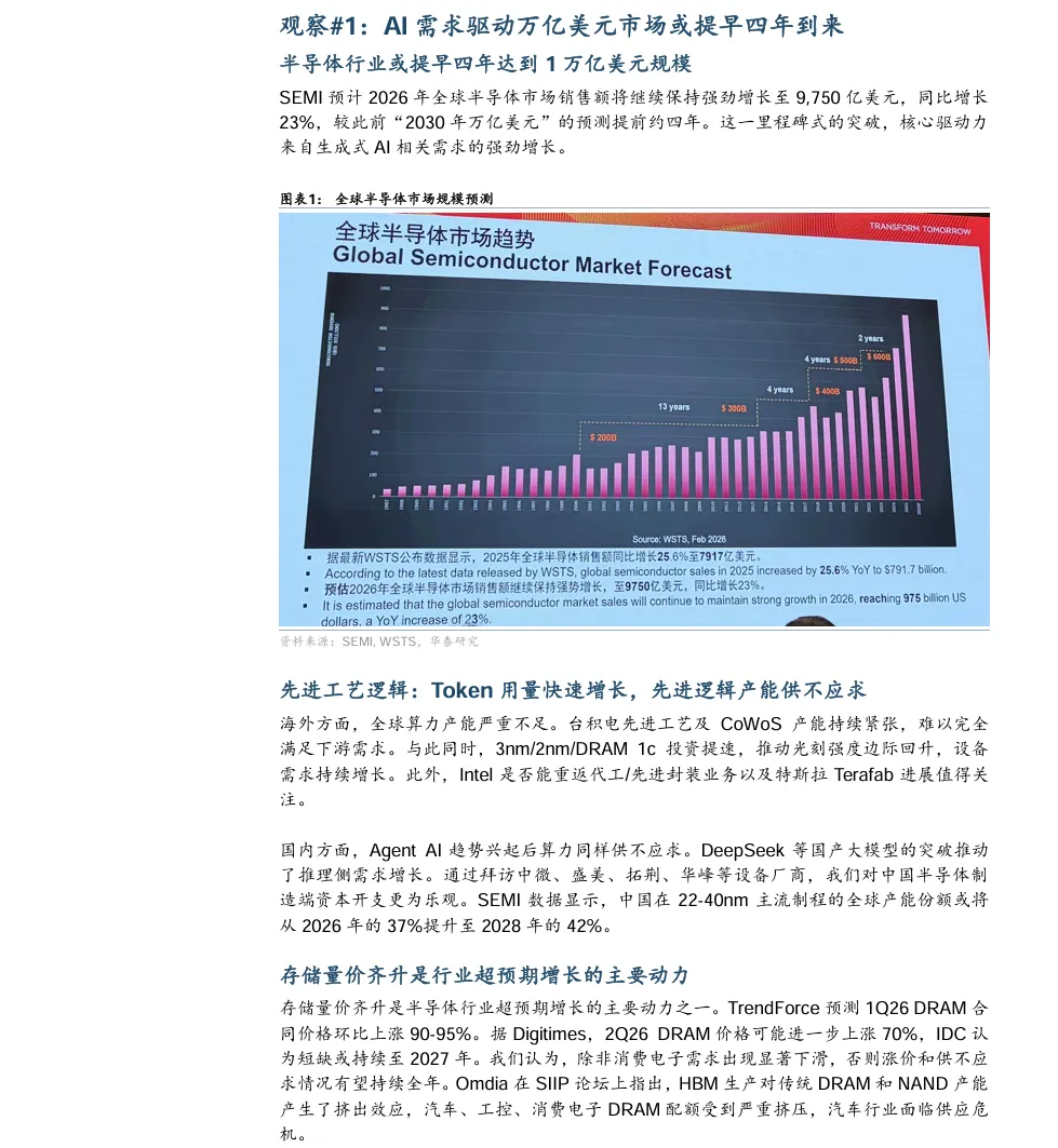 摘要:AI需求持续驱动下,SEMI预测2026年全球半导体行业增速有望达到23%,行业规模有望提前四年接近1万亿美元,AI半导体正迎来全新增长周期。本次SEMICONChina2026上,行业明确两大核心技术主线:先进封装成为延续摩尔定律的关键,全球市场2030年将达790亿美元,面板级封装成为行业共识,国内已形成晶圆厂补位+OSAT扩产+设备国产化的协同格局;同时“铜退光进”趋势不可逆,CPO技术可将功耗降低70%,破解算力增长的互连带宽瓶颈,光互连产业迎来确定性增长机遇。