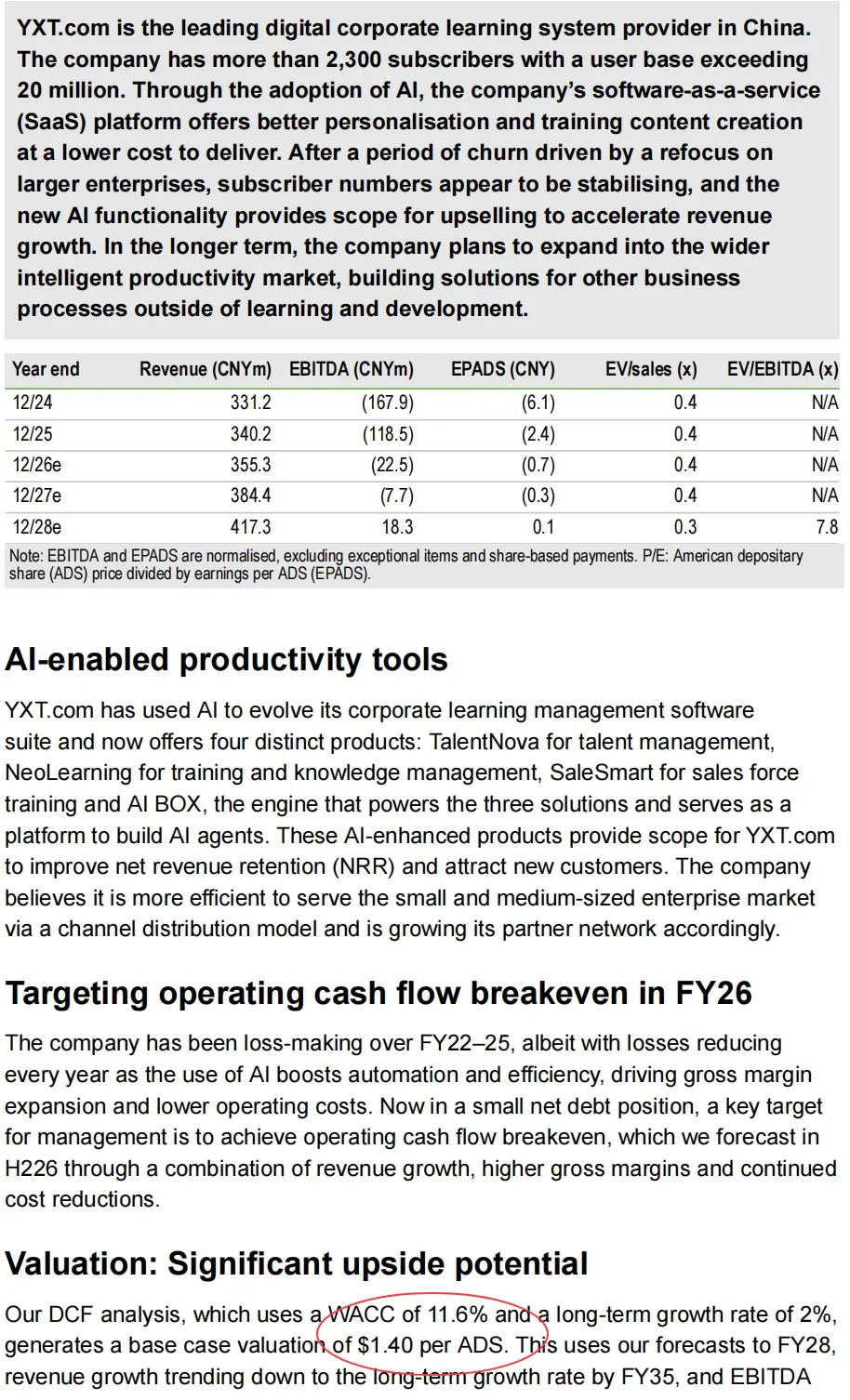 报告指出,以绚星的现金流折现分析(DCF)采用 11.6%的加权平均资本成本(WACC)和 2%的长期增长率,得出每股美国存托股份(ADS)的基本估值为1.40美元。