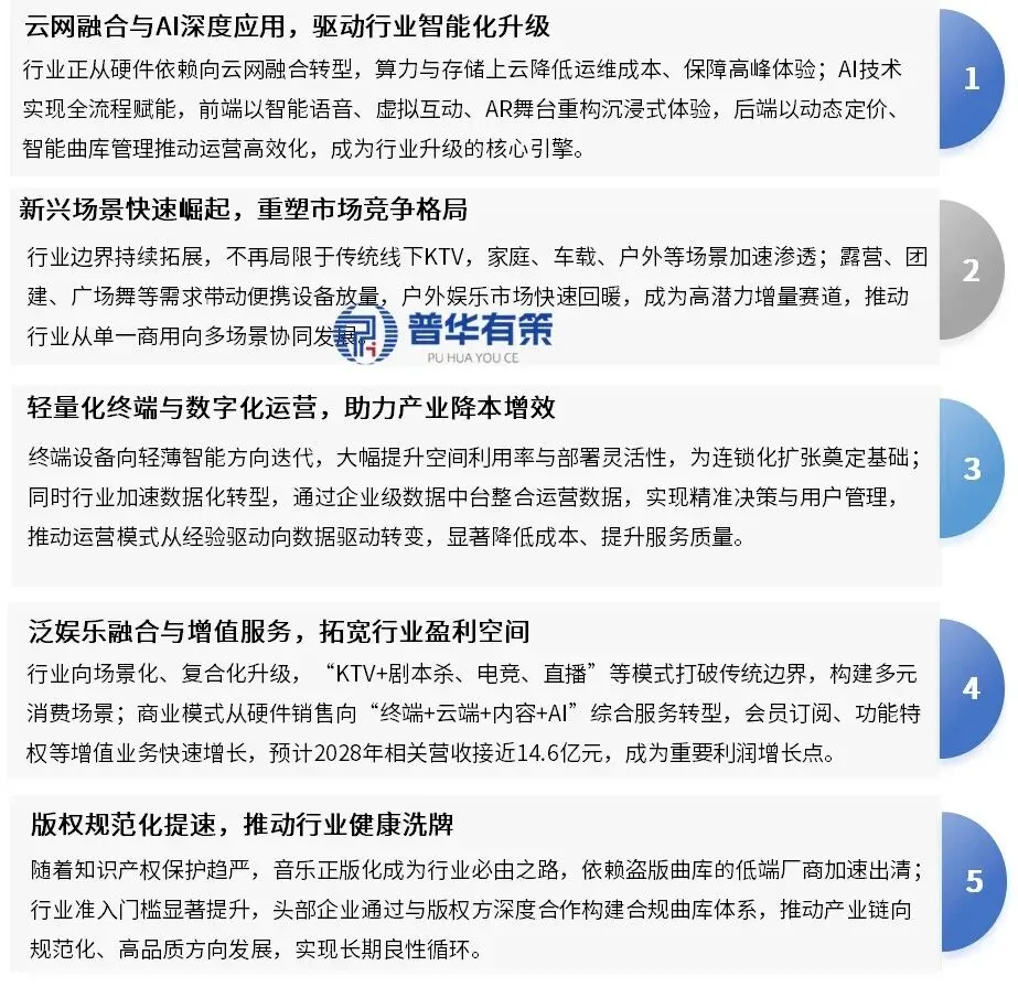 多场景KTV系统行业顺应文化产业数字化与消费升级需求,正从硬件依赖向云网协同转型,依托云计算、AI等技术打造集云端内容分发、智能修音、声光电联动于一体的数字化娱乐平台,既推动线下KTV智能化升级、提升运营效率,又丰富家庭、车载、户外等场景娱乐供给,成为文娱产业供给侧改革与消费扩容的重要支撑;目前行业市场稳健复苏、规模持续扩容,业务结构由单一商用向多场景延伸,预计2028年商用、家庭、户外娱乐营收将分别达6.9亿元、6.4亿元、5.8亿元,车载娱乐增长强劲,整体形成多场景协同发展格局,发展空间显著拓宽。