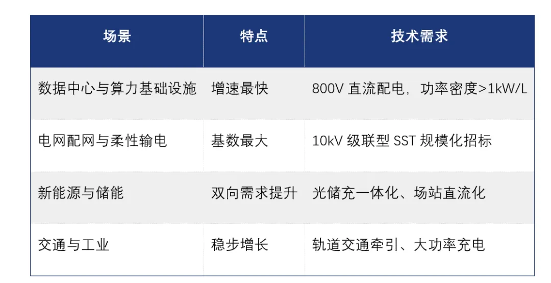 数据中心与算力基础设施增速最快,800V直流配电渗透率快速提升,成为SST第一大应用场景;电网配网与柔性输电市场基数最大,10kV级联型SST逐步进入规模化招标;新能源与储能以光储充一体化、场站直流化为主要方向,双向SST需求持续提升;交通与工业领域则在轨道交通牵引、电动船舶、大功率充电等场景稳步增长。