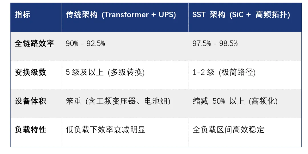 效率方面,统架构经过“中压-低压-整流-逆变-再整流”多级变换,全链路损耗高达 7%-10%。在 PUE 硬性指标下,传统模式已达节能极限。SST采用SiC等低损耗器件与高频拓扑,系统效率可达98%,全负载区间效率稳定,对数据中心等持续高负荷场景可实现3%-5%的节电收益。