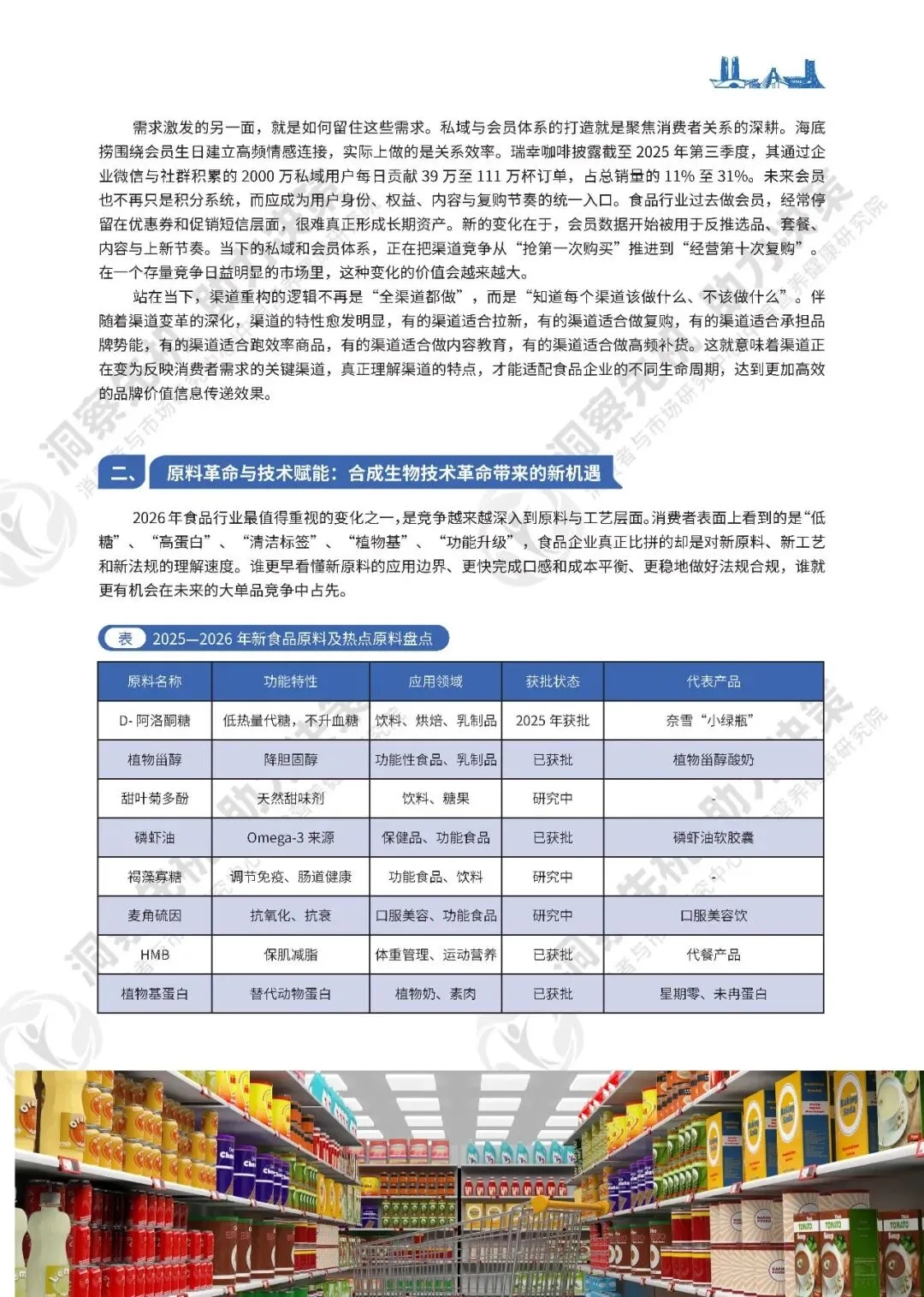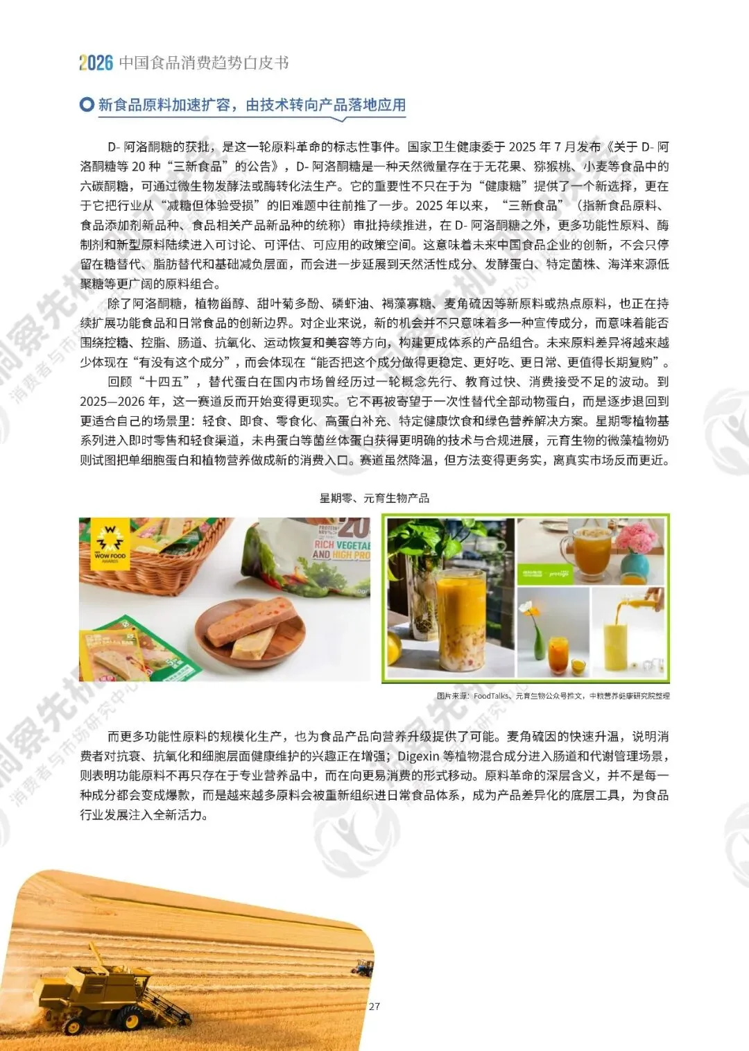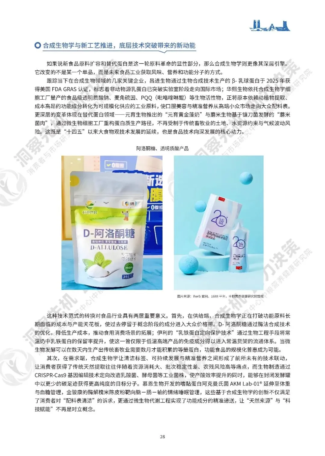 原料革命与技术赋能,正在把食品行业的竞争推向更深的底层。2025 年 D - 阿洛酮糖等 20 种三新食品获批,新食品原料目录持续扩容,让食品创新有了更广阔的空间。而合成生物学的突破,更是从根本上改变了食品工业获取风味、营养和功能分子的方式。它打破了功能原料长期面临的成本与产能天花板,让过去只能停留在概念阶段的成分,得以进入大众价格带,也让清洁标签、可持续发展与精准营养之间,形成了前所未有的技术联动。