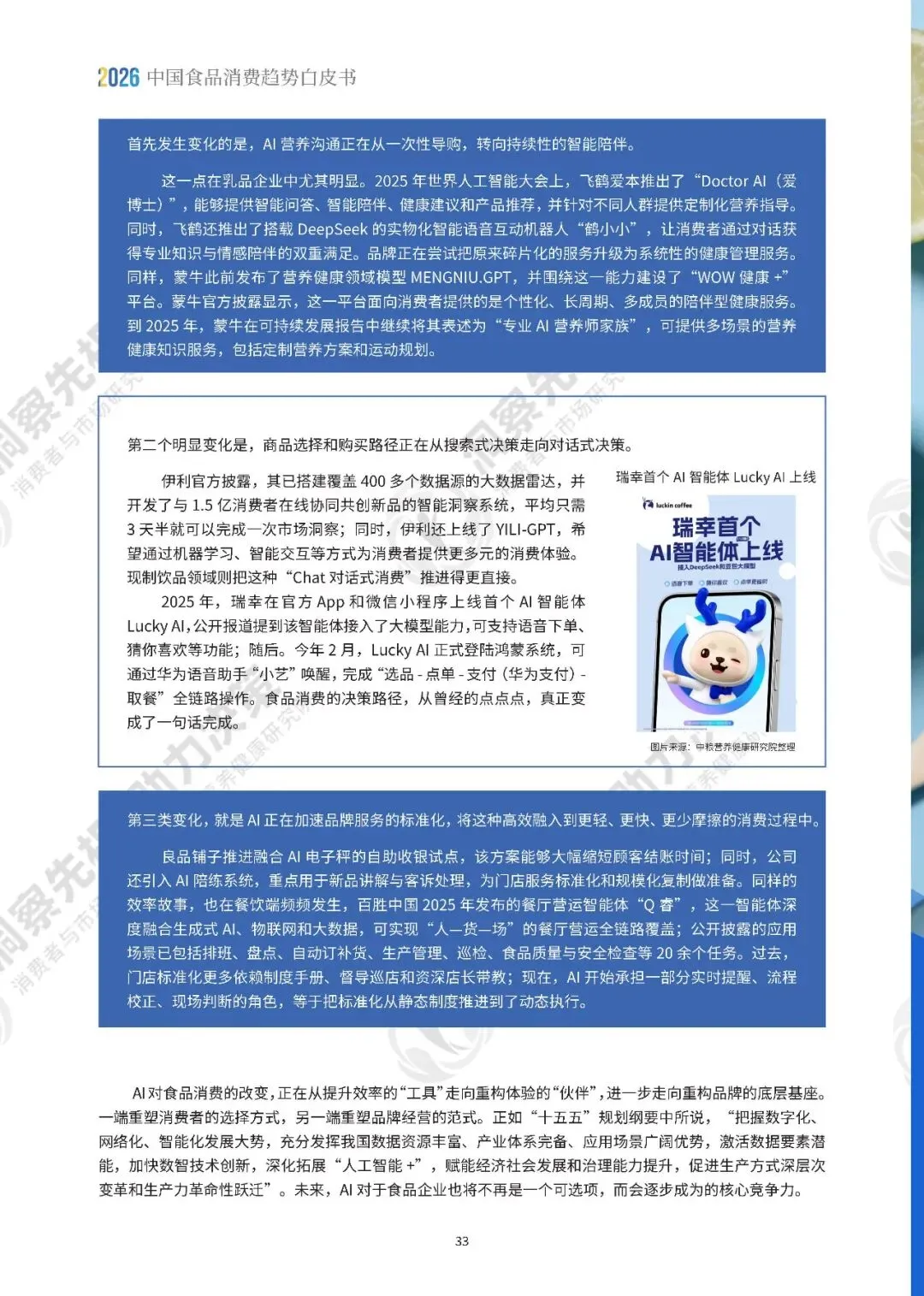 AI 对行业的改造,早已跳出了做海报、写文案的基础应用。在研发端,它能加速菌株筛选,优化产品配方,缩短研发周期,打通从消费需求到产品创新的高速路。在生产端,它能实现全链路的质量控制,实时预警生产风险。在供应链端,它能完成动态需求预测,减少库存与损耗。在消费端,它从工具走向了消费体验升级,智能营养咨询、对话式点单、标准化服务落地,AI 正在重新定义品牌与消费者的连接方式,也正在逐步成为食品企业的核心竞争力。