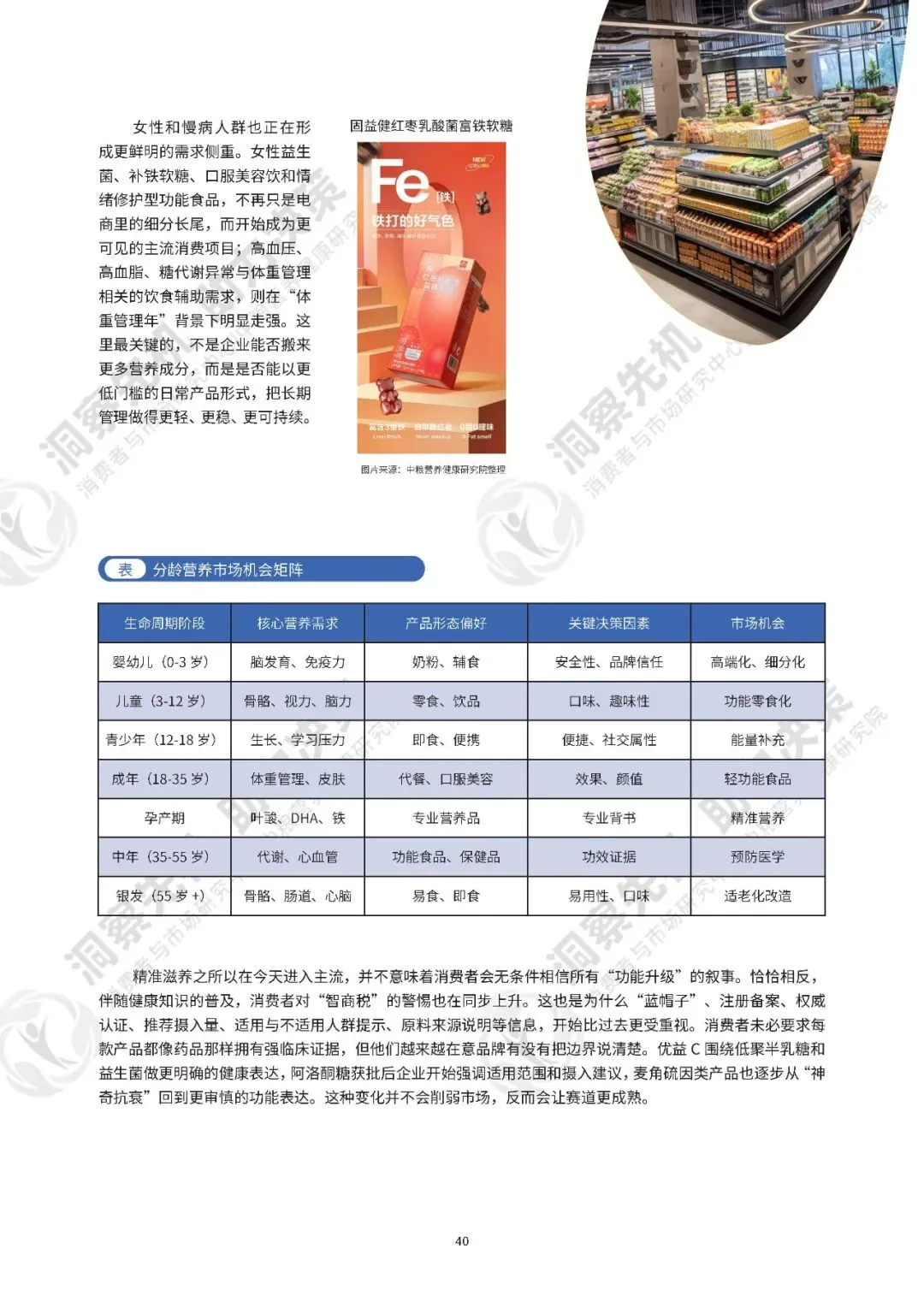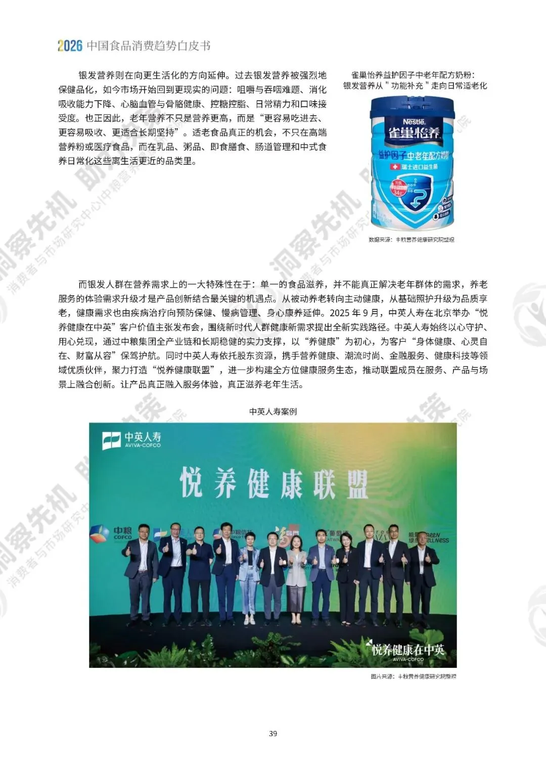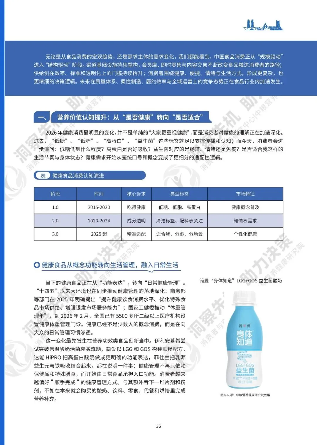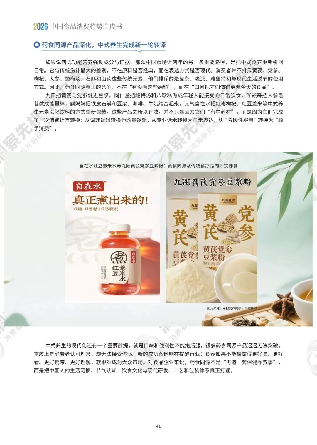 产品创新的逻辑,也在发生根本性的转向。健康认知的升级,是最核心的主线。消费者对健康的理解,从笼统的是否健康,转向了更核心的是否适合我。健康食品走过了吃得健康的 1.0 时代,成分透明的 2.0 时代,如今正式进入了精准适配的 3.0 时代。消费者不再满足于低糖、低脂、高蛋白的简单标签,而是会追问这个配方是否适配自己的生命阶段,是否符合自己的生活场景。分龄营养、分场景营养成为主流,药食同源的中式养生也完成了新一轮现代化转译,从复杂的调理逻辑,变成了能融入日常的随手消费。