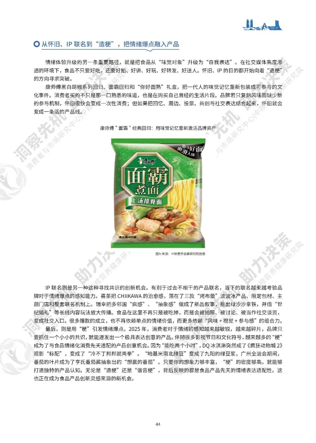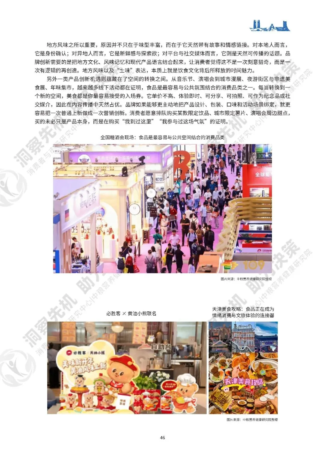 情绪与感官体验的升级,让食品有了更丰富的价值维度。在快节奏的生活里,食品成了大多数人最低门槛、最即时的情绪调节工具。一杯饮品,一包零食,一款限定口味,就能完成一次微小的情绪修复。食品消费接住了普通人最细碎的情绪诉求,疗愈价值被无限放大。从怀旧味觉记忆的唤醒,到 IP 联名的情绪共振,再到网络热梗的创意融合,食品不再只是单纯的味觉对象,更是年轻人的社交货币,是自我表达的载体。在地文化的深度挖掘,文旅场景的深度融合,也让食品创新找到了时空维度的新机遇,地方风味从猎奇尝鲜,一步步走向了主流消费市场。