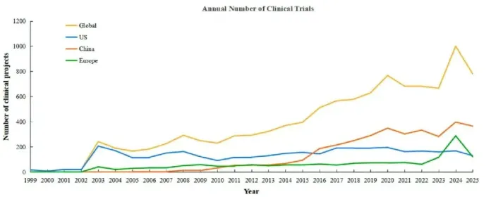 细胞治疗作为现代医学的核心前沿领域,凭借活细胞精准靶向病灶、修复受损组织、恢复生物功能的独特优势,已成为攻克肿瘤、免疫疾病等多种疑难病症的重要方向。相较于传统小分子药物和生物制剂,细胞治疗在临床应用中展现出不可替代的价值。本研究通过对全球顶级临床试验数据库、药监机构公告及相关文献的综合检索与分析,全面梳理了细胞治疗的全球发展格局,展现出该领域蓬勃的发展态势。