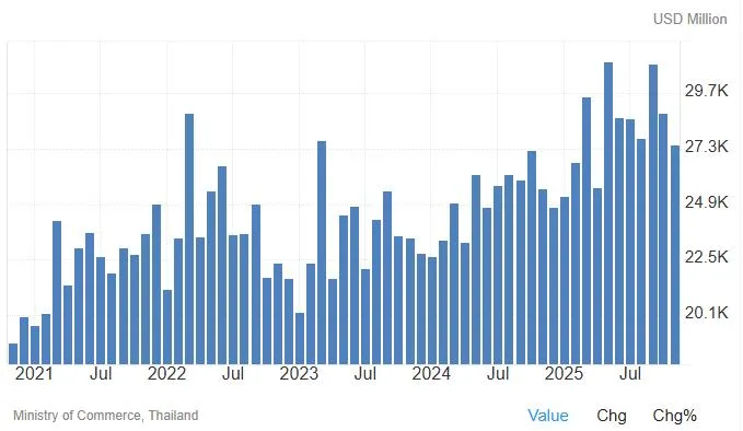 2025年泰国出口增速明显放缓,三季度商品和服务出口增速降至6.9%,受美国加征关税影响显著,泰国对美出口中82%属于被加征高额关税类别。