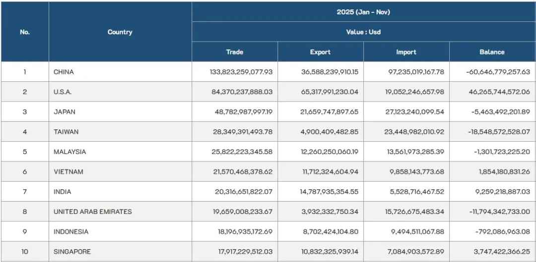 从进出口总贸易额来看,泰国的最大贸易伙伴依次为中国(不含港澳台)、美国、日本,泰国依赖从中国进口商品,2025年1至11月泰国从中国进口超972亿美元商品。