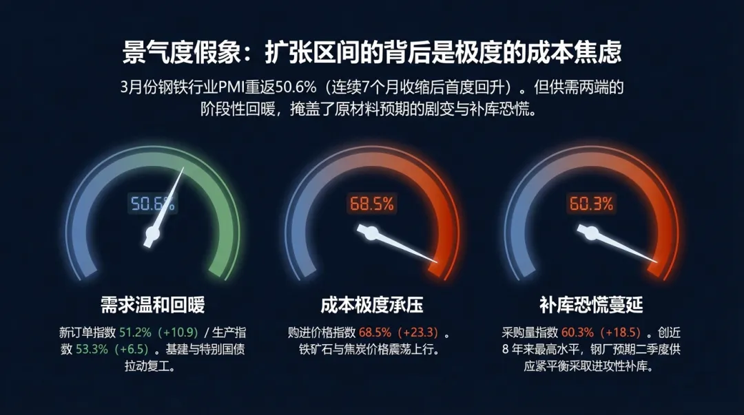 2026年一季度,中国钢铁工业进入了从“增量发展”向“存量优化”及“绿色转型”全面跨越的核心期。受“十五五”规划开局动能释放、碳边境调节机制(CBAM)正式实施以及国内产能置换政策深度修订的多重影响,行业在景气度、需求结构、成本结构及竞争格局上呈现出前所未有的复杂特征。3月份钢铁行业PMI指数在连续7个月收缩后重返50.6%的扩张区间,显示出供需两端的阶段性回暖。然而,出口许可证新政与绿色贸易壁垒的叠加,使得“内卷式”竞争转向了以“碳效”和“精深加工”为核心的高维竞争。章:行业景气度分析:PMI重返扩张区间及其内生动力2026年一季度的宏观运行轨迹呈现出明显的“触底回升”特征。根据中国物流与采购联合会钢铁物流专业委员会发布的数据,3月份中国钢铁行业采购经理指数(PMI)录得50.6%,较2月份大幅回升3.9个百分点,这是该指数自2025年下半年以来首次回归扩张区间 。这一变动不仅是季节性复苏的体现,更是行业内部结构调整与外部政策引导共同作用的结果。从分项指数看,3月份生产指数和新订单指数分别为53.3%和51.2%,环比分别上升6.5个百分点和10.9个百分点。新订单指数创下近8个月以来的新高,反映出下游基建项目在超长期特别国债的支持下,复工强度超过了往年同期。与此同时,生产指数的强力回升,标志着北方采暖季环保限产政策退出后,钢厂在利润修复预期下的产能释放意愿显著增强。核心PMI分项指数 | 2026年1月 (%) | 2026年2月 (%) | 2026年3月 (%) | 环比变动 (百分点) |