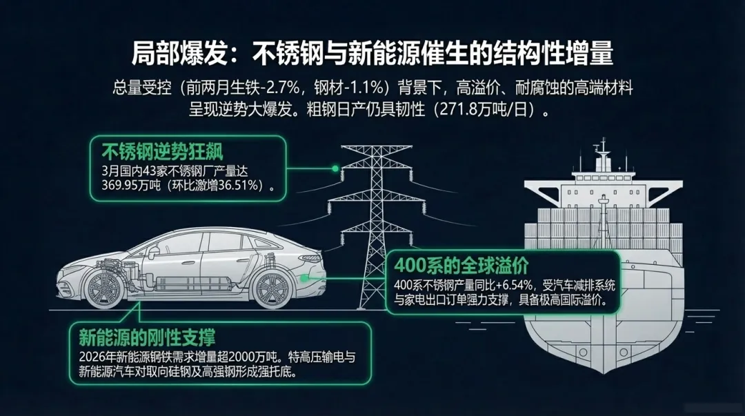 特别值得关注的是,3月份采购量指数录得60.3%,创下近8年来的最高水平 。这一现象揭示了钢铁企业在面对原材料价格震荡上行时的补库焦虑。由于“十五五”规划对重大工程的密集部署,钢厂普遍预期二季度将出现原材料供应紧平衡,因此在3月份采取了极具进攻性的补库策略,这进一步推高了铁矿石和焦炭的购进价格指数至68.5%的历史高位。在一季度,中国钢铁产量表现出“总量受控、局部爆发”的特征。国家统计局数据显示,1-2月份全国生铁产量为13770万吨,同比下降2.7%;钢材产量为22119万吨,同比下降1.1%。这种降幅主要源于政策层面对“低效产出”的持续压减,以及2026年碳达峰目标压力下的企业自发性限产。尽管总量同比微降,但日产水平却在低基数下显示出韧性。1-2月份我国日产粗钢达到271.8万吨,创下近8个月以来的新高 。进入3月,中钢协监测的重点钢企粗钢日产在3月上旬达到201.1万吨(环比升3.3%),中旬进一步升至202.7万吨 。这种“先抑后扬”的产量曲线,反映出行业在政策调控与市场复苏之间的动态平衡。在普钢产量受限的同时,不锈钢品类在三月份表现出爆发式增长。根据Mysteel统计,3月国内43家不锈钢厂粗钢预估产量达369.95万吨,环比增幅高达36.51%。不锈钢分类 | 3月产量 (万吨) | 月环比变动 (%) | 同比变动 (%) | 驱动因素 |