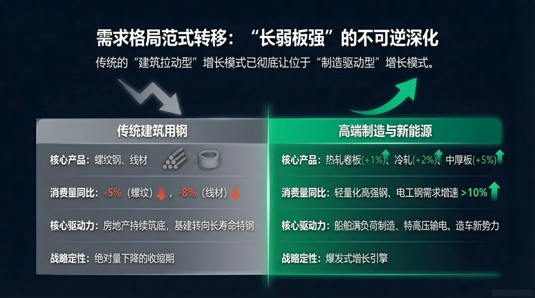 不锈钢产量的激增反映了中国制造业在向高端化转型过程中,对耐腐蚀、高强度材料的需求占比正在稳步提升。特别是400系不锈钢在汽车减排系统和家电领域的广泛应用,使其在国际市场仍具备较强的溢价能力。2026年一季度,钢铁需求侧的“二元分化”趋势愈发深刻。传统的“建筑拉动型”增长模式已彻底让位于“制造驱动型”增长模式。截至2026年一季度末,五大主要钢材品种中,螺纹钢和线材的表观消费量延续了下滑走势,同比分别下降5%和8% 。房地产市场的持续筑底导致长材需求严重萎缩,基建投资虽有对冲作用,但更多转向了高标准、长寿命的特殊钢材,而非传统的建筑钢筋。这意味着建筑用钢市场已进入绝对量下降的收缩期。与长材的颓势相反,板材消费量呈现出稳健增长。热轧卷板、冷轧卷板及中厚板消费量同比分别增加1%、2%和5%。- 中厚板 :受船舶制造订单满负荷运行(尤其是液化天然气运输船、大型集装箱船)以及风电塔筒建设的拉动,中厚板成为一季度表现最稳健的品种。