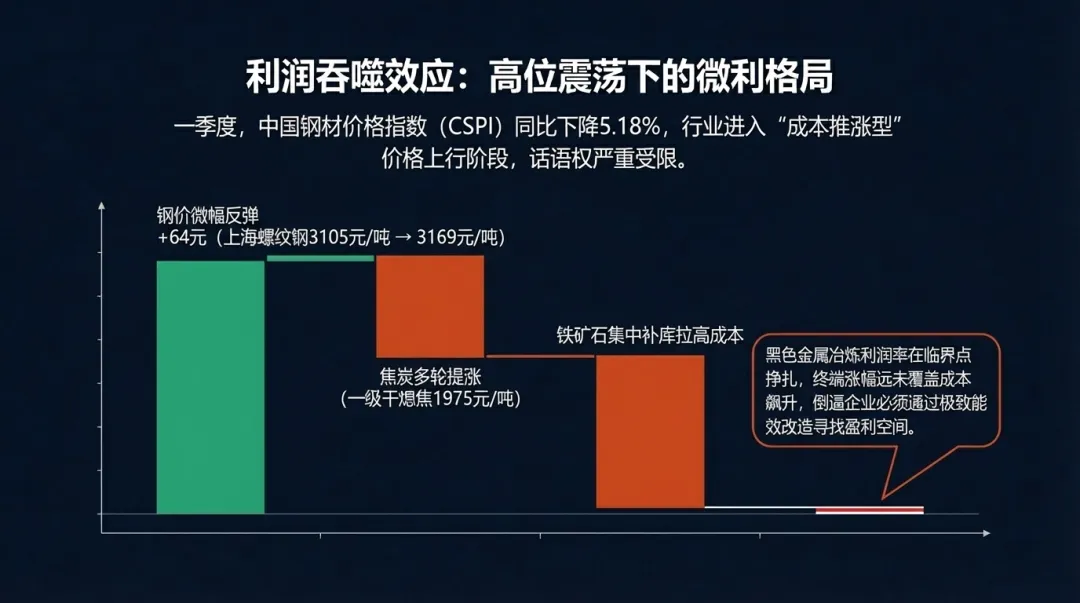 研究预测,2026年新能源产业对钢铁的需求增量将超过2000万吨。国家电网新型电力系统的建设,特别是特高压输电线路的密集上马,对取向硅钢及超高强钢结构件形成了刚性支撑。一季度,钢铁企业的利润修复过程极其艰难。购进价格指数在3月份跃升至68.5%,标志着行业进入了“成本推涨型”的价格上行阶段。1月末,中国钢材价格指数(CSPI)为91.19点,同比下降5.18%。尽管3月份上海螺纹钢价格从3月初的3105元/吨震荡上涨至3月23日的3169元/吨,但这种涨幅远未覆盖同期原材料价格的飙升。- 焦炭 :4月初执行的价格显示,一级干熄焦到厂价报1975元/吨,一级湿熄焦报1610元/吨 。受矿山安全监察常态化及焦煤进口受限影响,焦炭价格在三月下旬经历了多轮提涨。
