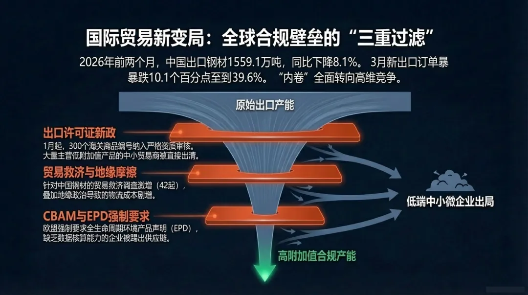 这种供需错配加剧了利润的流向。规模以上制造业在一季度利润虽有增长,但黑色金属冶炼和压延加工业的利润率依然在临界点挣扎,倒逼企业必须通过极致能效改造来寻找盈利空间。2026年1月1日,欧盟碳边境调节机制(CBAM)正式实施,这成为中国钢铁出口史上的分水岭。海关数据显示,2026年前两个月,中国出口钢材1559.1万吨,同比下降8.1% 。- 政策约束 :自1月起,300个海关商品编号的钢铁产品被纳入出口许可证管理。严格的申领流程和资质审核,直接筛选掉了大量主营低附加值产品的中小贸易商。