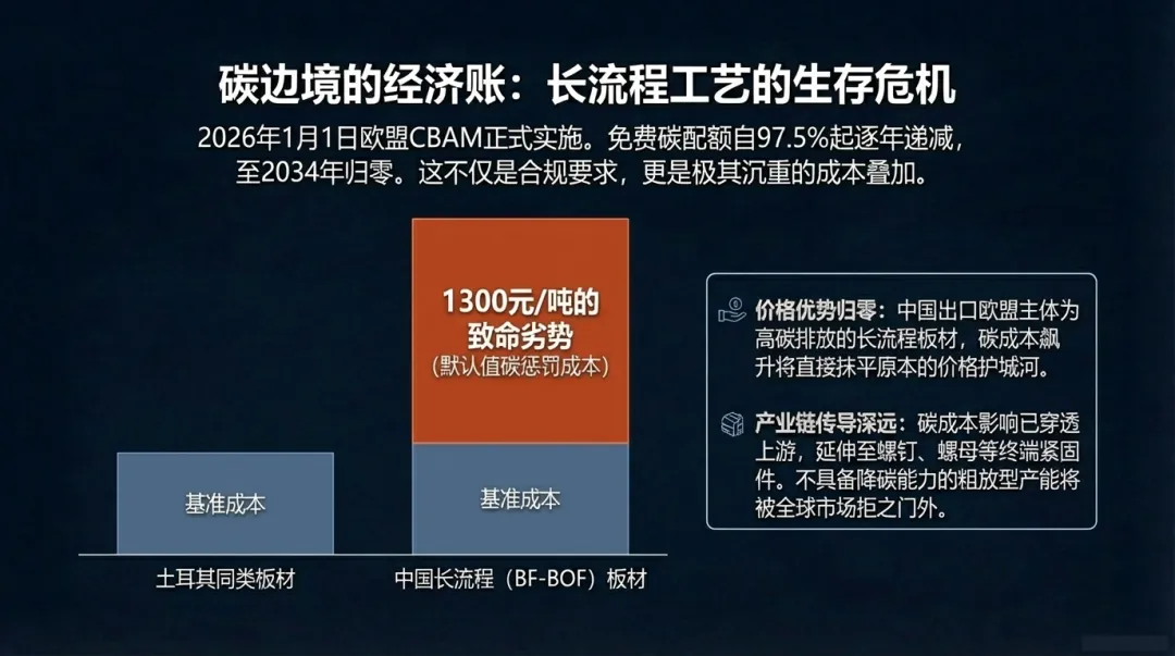 CBAM对中国钢企出口成本的影响是全方位的。欧盟免费碳配额比例从2026年的97.5%开始逐年递减,到2034年归零。- 成本缺口 :若不进行实测核算,中国钢材的“默认值成本”处于全球塔尖,成本基线比土耳其同行高出近1300元/吨。