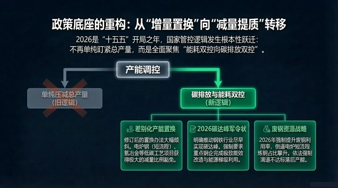 2026年一季度,政策层面对钢铁行业的管控逻辑发生了根本性变化,不再仅仅关注产量,而是聚焦于“能耗双控向碳排放双控”的转型。2026年国民经济发展计划报告明确,将“有序压减钢铁行业产能”作为核心目标。- 差别化置换比例 :修订后的产能置换办法对发展电炉钢、氢冶金等低碳工艺的项目给予了大幅度的减量比例倾斜。