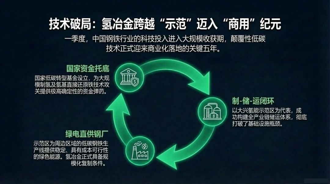 一季度,中国钢铁行业的科技投入开始进入“收获期”,多个颠覆性技术实现了从示范向商用的跨越。2026年春天,中国氢冶金项目进入规模化应用阶段。- 资金保障 :国家低碳转型基金的设立,为大规模制氢及氢基直接还原铁技术攻关提供了稳定资金支持。