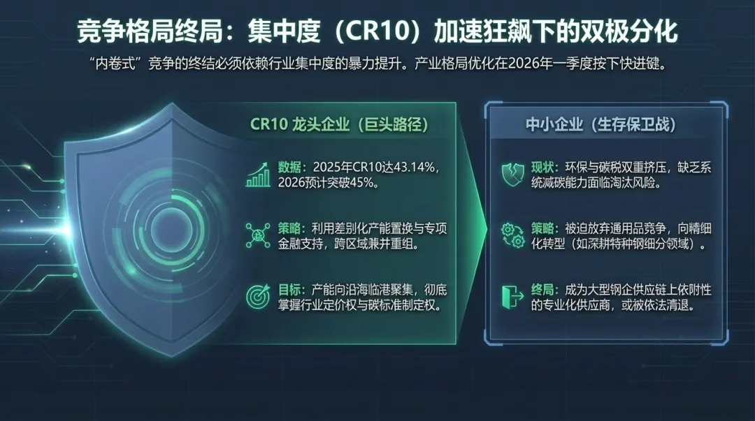 “内卷式”竞争的终结有赖于行业集中度的提升。2026年一季度,产业格局优化的步伐明显加快。2025年中国钢铁行业CR10已达43.14%,预计2026年将突破45%。- 区域协调 :钢铁产能继续向沿海临港地区适度聚集,提高资源循环化和物流集约化水平。