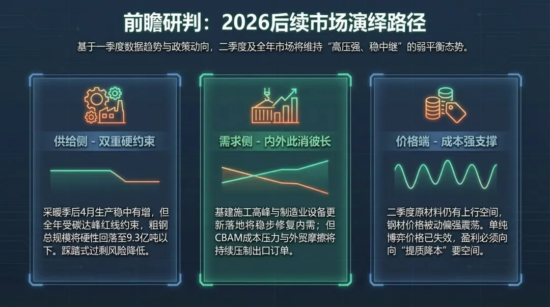 在环保和碳税的双重挤压下,缺乏专业化优势的中小企业生存空间被进一步压缩。政策引导其向精细化、特色化转型,如深耕特种钢细分领域,成为大型钢企供应链上的专业化供应商。基于一季度的数据趋势和政策动向,对2026年后续走势做出如下预判:由于采暖季环保限产的结束,4月份钢厂生产将保持稳中有增,但全年的粗钢产量受碳达峰目标约束,总规模预计将回落至9.3亿吨以下。产量调控的精准化将有效防止供应端过剩造成的踩踏。二季度,随着基建项目全面进入施工高峰,以及制造业设备更新政策的资金落地,国内需求将稳步修复。然而,CBAM带来的出口成本压力及国际贸易摩擦将继续压制出口订单,导致国内市场竞争依然激烈。原材料价格在二季度或仍有上行空间,受此带动,钢材价格也将偏强震荡。企业盈利水平的改善将主要依赖于“提质降本”而非单纯的价格上涨。2026年一季度是中国钢铁工业转型的一个缩影:在碳规制的“铁律”下,行业正经历着痛苦但必要的结构性出清。- 加强碳资产管理 :企业应建立与CBAM接轨的碳足迹盘查体系,避免因使用默认值而造成的不必要成本支出。