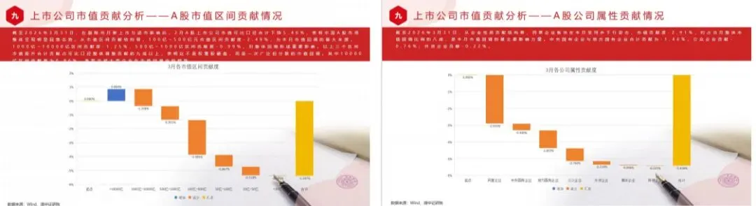 在剔除当月新上市与退市影响后,2月A股上市公司市值可比口径合计下降5.40%,表明中国A股市场整体呈现明显回落态势。从市值区间贡献结构看,100亿~500亿元市值区间贡献度-2.49%,为本月市值回调的最大来源,1000亿~10000亿区间贡献度-1.25%,500亿~1000亿区间贡献度-0.99%,对整体回调形成重要影响。以上三个区间市值提升合计贡献占可比口径整体调整贡献的九成以上,表明这不是权重股砸盘,而是一次广泛但分散的市值回调。其中10000亿区间贡献度为0.86%,表现出超大型企业在市场回调中的韧性。从企业性质贡献结构看,民营企业板块在本月呈同步下行姿态,市值贡献度-2.91%,约占当月整体市值回调比例的八成,是本月市值回调的最主要影响因素。中央国有企业与地方国有企业合计贡献为-1.46%,公众企业贡献-0.76%;外资企业贡献-0.22%。