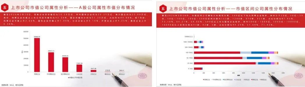 报告显示,截至2026年3月31日,民营企业总市值约为46.07万亿,中央国有企业约为28.55万亿,地方国企约为20.39万亿,其中,民营企业市值占上市公司总市值约为42.47%,国企市值合计约为48.94万亿,占比约为45.12%。较2月份,民营企业市值下降8.94%,国有企业市值下降4.71%,公众企业下降8.86%,外资企业下降4.64%,集体企业下降12.50%。市值区间公司属性分布情况方面,500亿以下均为民营企业较多,其中小于20亿、20亿~50亿、50亿~100亿、100亿~500亿区间分别为204家、1389家、908家、832家,占比分别为85.71%、73.45%、62.28%、53.47%;500亿以上均为国有企业较多,其中500亿~1000亿、1000亿~10000亿、10000亿以上区间分别为84家、83家、5家,占比分别为45.65%、51.55%、71.43%。
