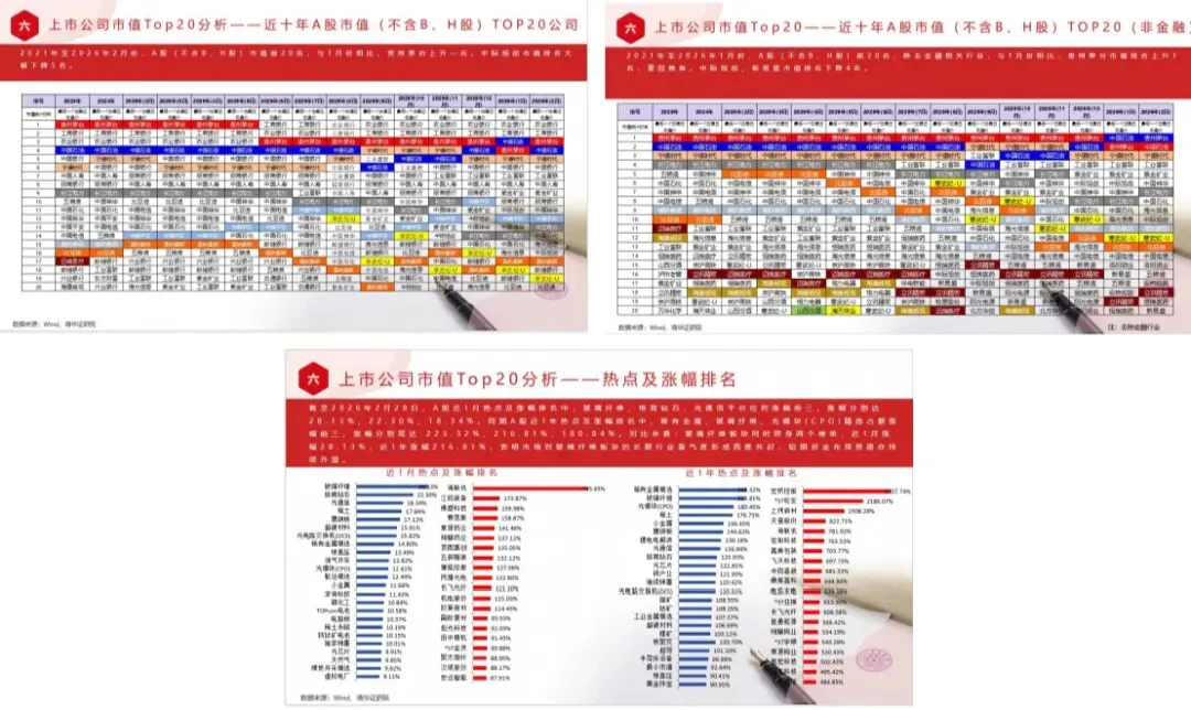 按总市值(包含A、B、H股)排名的前20家公司,入围门槛为6003亿,较2月提高16亿元。工商银行、农业银行、中国石油、建设银行、宁德时代排名靠前,其中总市值超万亿公司合计11家。整体前20家中,国企14家,民企3家,公众企业3家。2021年至2026年3月份总市值(包含A、B、H股)前20名,与2月份相比,宁德时代上升2名,中际旭创、邮储银行重回榜单。2021年至2026年3月份总市值(包含A、B、H股)前20名,除去金融相关行业,石油石化、电子等行业公司较多。较2月份,中国石油连续四个月蝉联第一,恒瑞医药排名重回前20名,宏桥控股退出前20。按A股(不含B、H股)市值排名的前20家公司,入围门槛为4402亿,农业银行、工商银行、中国石油、贵州茅台排名靠前,超过万亿市值的共计7家。前20家中,国企11家,占比55%;民营企业5家,公众企业4家。2021年至2026年3月份,A股(不含B、H股)市值前20名,与2月份相比,中国石油上升一名,新易盛首次进入榜单。2021年至2026年3月份,A股(不含B、H股)前20名,除去金融相关行业,与2月份相比,中国石油市值排名上升1名,重回榜首。比亚迪市值排名上升4名。 A股近1月热点及涨幅排名中,有色金属、硬件设备、石油石化位列涨幅前三,涨幅分别达80.24%、57.28%、47.69%。同期A股近1年热点及涨幅排名中,光模块(CPO) 、玻璃纤维、光通信占据涨幅前三,涨幅分别高达 268.40%、190.69%、181.04%。对比来看:近一月,有色金属、石油石化等周期资源板块领涨,资金从前期高景气的 AI、光通信等成长赛道高位流出,转向低估值、业绩弹性强的顺周期板块,反映出市场在3月调整背景下避险情绪升温、存量博弈加剧,风格呈现明显的高低切换特征;而近一年维度下,光模块 (CPO)、光通信等 AI 算力产业链,以及锂电、稀土等新能源上游赛道持续霸榜,涨幅远超传统板块,验证了高景气成长赛道是市场长期资金布局的核心主线。