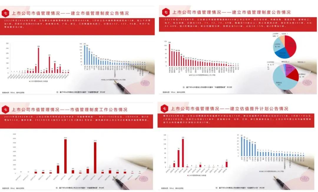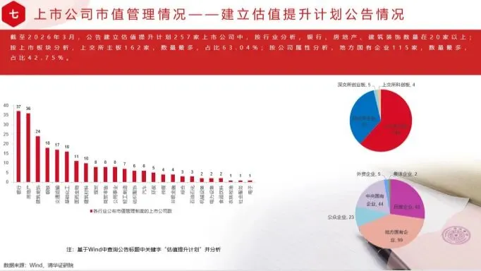 2022年至2026年3月份,公告建立市值管理制度的公司共计866家,3月份公告市值管理制度的有13家,较上个月增加5家。目前已公告的866家中,按省域分布,广东、浙江、江苏数量排名前三,分别为132、122、96家,本月广东增加最多为2家。2022年至2026年3月,公告建立市值管理制度的866家上市公司中,按行业分析,机械设备、医药生物、基础化工、电子、电力设备,分别为108、75、72、70、69家,数量在50家以上;按上市板块分析,深交所主板363家,占比41.92%,较2月增加3家;按公司属性分析,民营企业521家,占比60.16%,较2月增加3家。2015年至2026年3月,上市公司的不同形式公告中涉及“市值管理制度”,合计11946次公告,3月994次,较2月增加953次。整体来看,2024年9月《指引》以及12月《意见》发布后,越来越多的上市公司正在筹备市值管理制度。截至2026年3月,上市公司相继发布估值提升计划公告274次,建立估值提升计划的公司共计257家,3月份17次公告,2月份23次公告。目前已公告的257家中,按省域分布,北京、江苏、浙江数量排名前三。上市公司中既公布市值管理制度又公布估值提升计划的公司共25家。截至2026年3月,公告建立估值提升计划257家上市公司中,按行业分析,银行、房地产、建筑装饰数量在20家以上;按上市板块分析,上交所主板162家,数量最多,占比63.04%;按公司属性分析,地方国有企业115家,数量最多,占比42.75%。