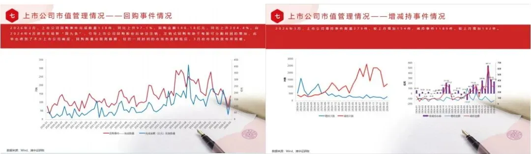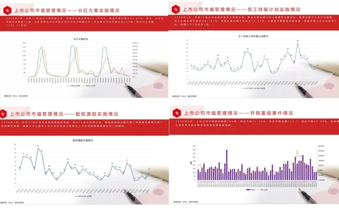 根据wind内地股票专题统计,2026年3月,共有17起分红方案实施公告,实施分红总金额为25.30亿元,较去年同比减少60.07%。其中,公告为实施完毕的有12起,分红类型多为公司进行年中分红与特殊分红。本年累计分红实施公告151起;累计分红金额1196.21亿元。2026年3月,共有15家公司完成实施员工持股计划。资金主要来源于员工薪酬及自筹资金,股票来源于上市公司回购。员工认购比例平均约为81.61%,高管认购比例平均约为13.25%。从董事会预案到实施完成,周期在两个月以内的有8起,周期大于1年的有1起。2026年3月,共有37家公司完成股权激励的实施,其中33家为民营企业。激励标的物主要为第二类限制性股票与第一类限制性股票。激励方式主要为上市公司定向发行股票及上市公司提取激励基金买入流通股。2026年3月,上市公司并购事件数量109件,同比下降51.56%;涉及并购金额522.7亿元,同比下降67.44%。政策红利所带来的并购市场热度显现衰退迹象。2026年3月,上市公司回购事件完成数量138件,同比上升97.1%,回购金额148.18亿元,同比上升304.4%。自2024年4月资本市场新“国九条”,引导上市公司回购股份后依法注销,注销式回购有助于每股可分配利润的增加,此举也得到了不少上市公司响应,回购数量出现高峰期,经历一段时间的市场热度降低后,3月份市场热度有所回暖。2026年3月,上市公司增持事件数量279件,较上月增加154件,减持事件1189件,较上月增加192件。