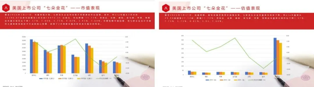 作为美股信息技术行业的核心支柱,英伟达、微软、苹果、亚马逊、谷歌、Meta、特斯拉七家代表性科技公司,截至2026年3月31日,市值表现方面,七家龙头企业均出现不同程度的环比回调。其中,Meta市值从2月末的16396.07亿美元回落至3月末的14472.35 亿美元,环比降幅 11.73%;英伟达、谷歌、微软、亚马逊、苹果、特斯拉市值分别环比下降1.57%、7.86%、5.75%、0.82%、3.93%、7.64%。尽管短期市值回调,但七家企业合计市值仍占据美股信息技术行业的核心权重,延续了2月美股市值向科技龙头集中的特征。估值层面,板块估值呈现同步回落态势,七家龙头企业市盈率均有所下降:Meta市盈率从 29.98倍回落27.12倍,降幅11.73%;英伟达、谷歌、微软、亚马逊、苹果、特斯拉市盈率分别环比下降1.57%、7.75%、5.73%、0.81%、3.93%、7.64%。