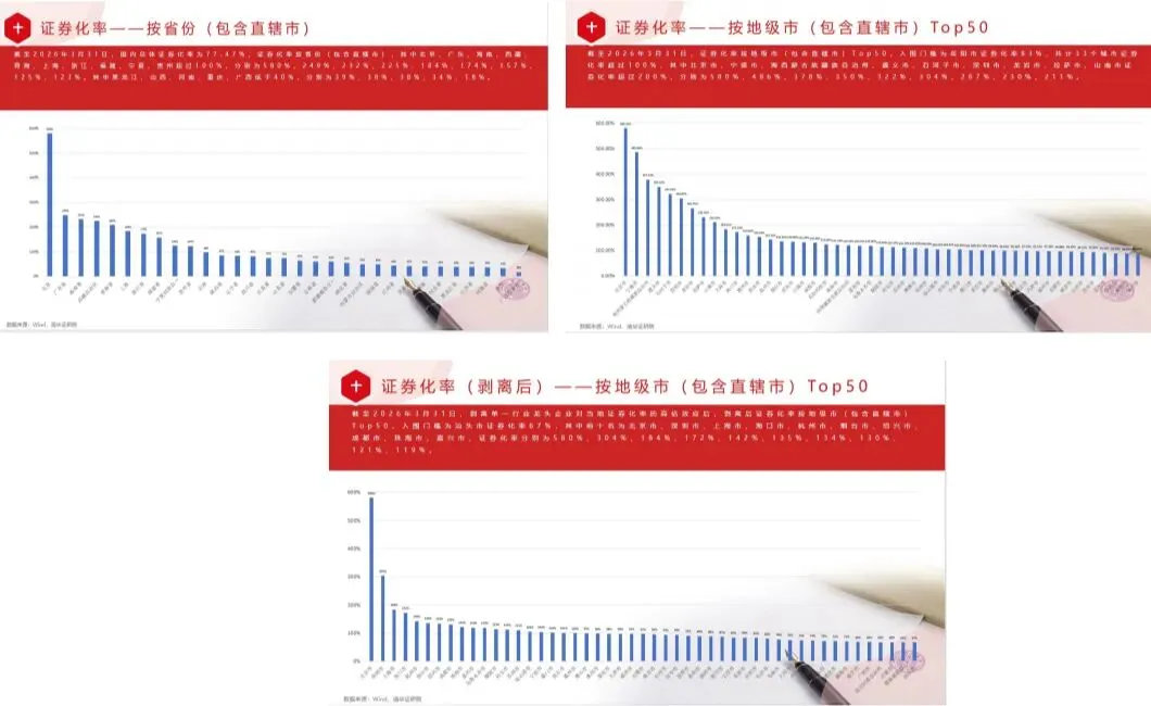 截至2026年3月31日,国内总体证券化率为77.47%,证券化率按省份(包含直辖市),其中北京、广东、海南、西藏、青海、上海、浙江、福建、宁夏、贵州超过100%,分别为580%、249%、232%、225%、184%、174%、157%、125%、123%。其中黑龙江、山西、河南、重庆、广西低于40%,分别为39%、38%、38%、34%、18%。证券化率按地级市(包含直辖市)Top50,入围门槛为岳阳市证券化率83%,共计33个城市证券化率超过100%,其中北京市、宁德市、海西蒙古族藏族自治州、遵义市、石河子市、深圳市、龙岩市、拉萨市、山南市证券化率超过200%,分别为580%、486%、378%、350%、322%、304%、267%、230%、211%。剥离单一行业龙头企业对当地证券化率的高估效应后,剥离后证券化率按地级市(包含直辖市)Top50,入围门槛为汕头市证券化率67%,其中前十名为北京市、深圳市、上海市、海口市、杭州市、烟台市、绍兴市、成都市、珠海市、嘉兴市,证券化率分别为580%、304%、184%、172%、142%、135%、134%、130%、121%、119%。