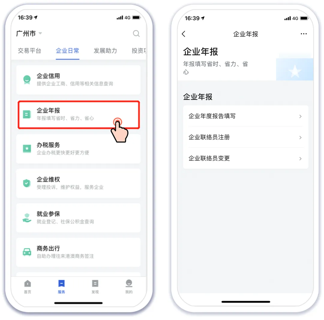 打开“粤商通”APP,点击底部【服务】切换页面,打开服务板块【企业日常】,点击【企业年报】即可进入。