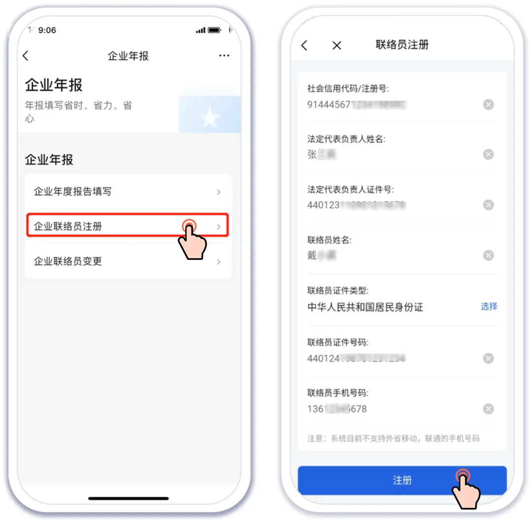 如果是第一次填报年报的企业用户,需先点击【企业联络员注册】,填写联络员证件信息、联系号码后,点击【注册】按钮即可。