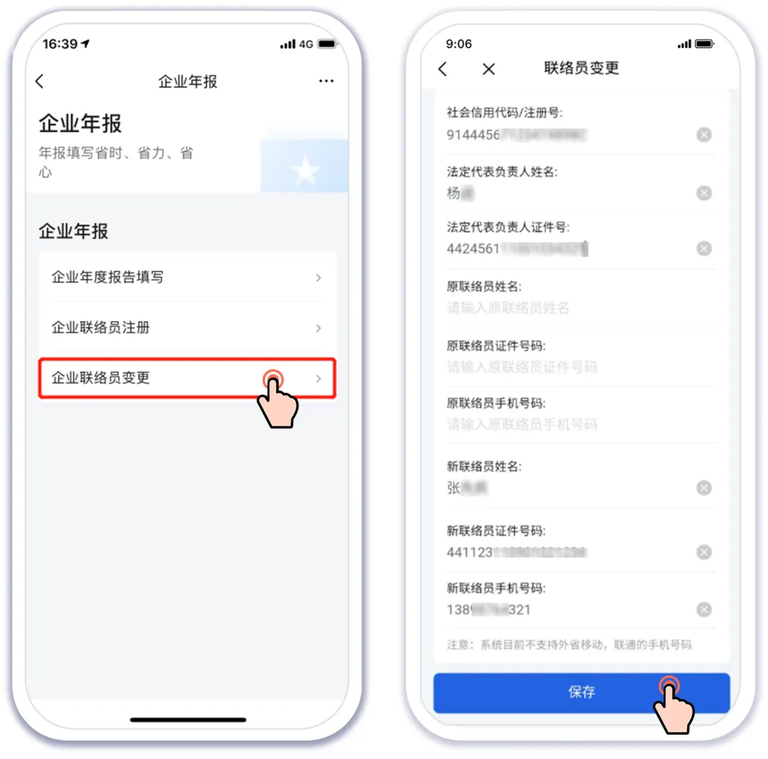 若原联络员信息错误或联络员需要变动的,可点击【企业联络员变更】,填写变更后的联络员信息后,点击【保存】按钮即可。