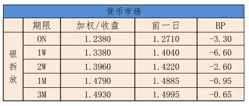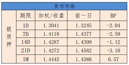 今日银行间市场主要回购利率整体下行。隔夜加权平均利率收盘于1.3041%,上日的收盘价为1.3245%,下行2.04BP;14天收盘价为1.4287%,相比较昨天的收盘价格1.4399%,下行1.12BP。