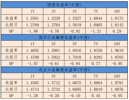 国开债曲线今天收益整体下行,3年期带动曲线对应期限下行0.61BP,至1.5861%;5年期带动曲线对期限下行0.94BP,至1.6916%;10年期带动曲线对应期限下行0.95BP,至1.9610%。