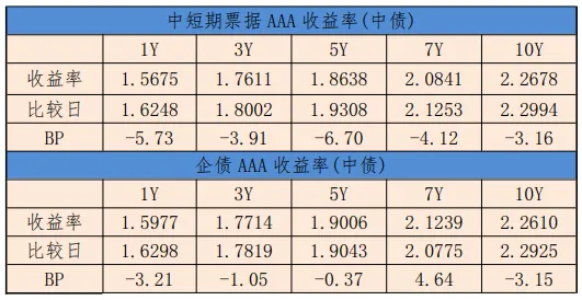 中债中短期票据收益率曲线(AAA)1年期收益率下行5.73BP,至1.5675%,3年期收益率下行3.91BP,至1.7611%。