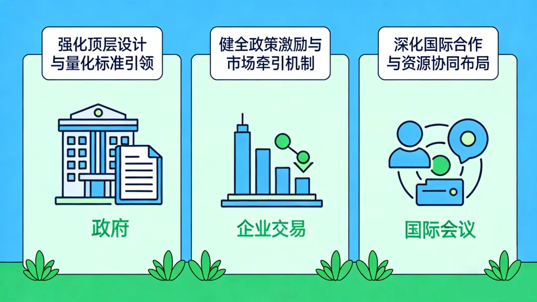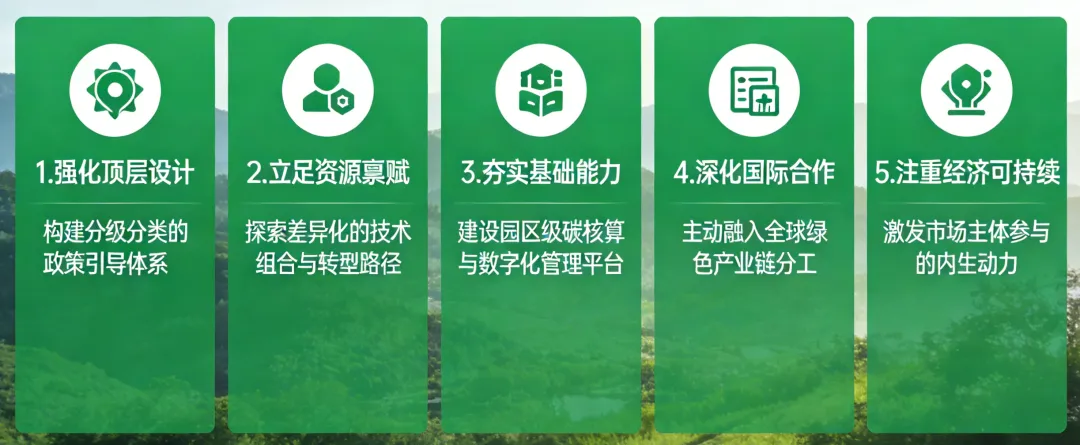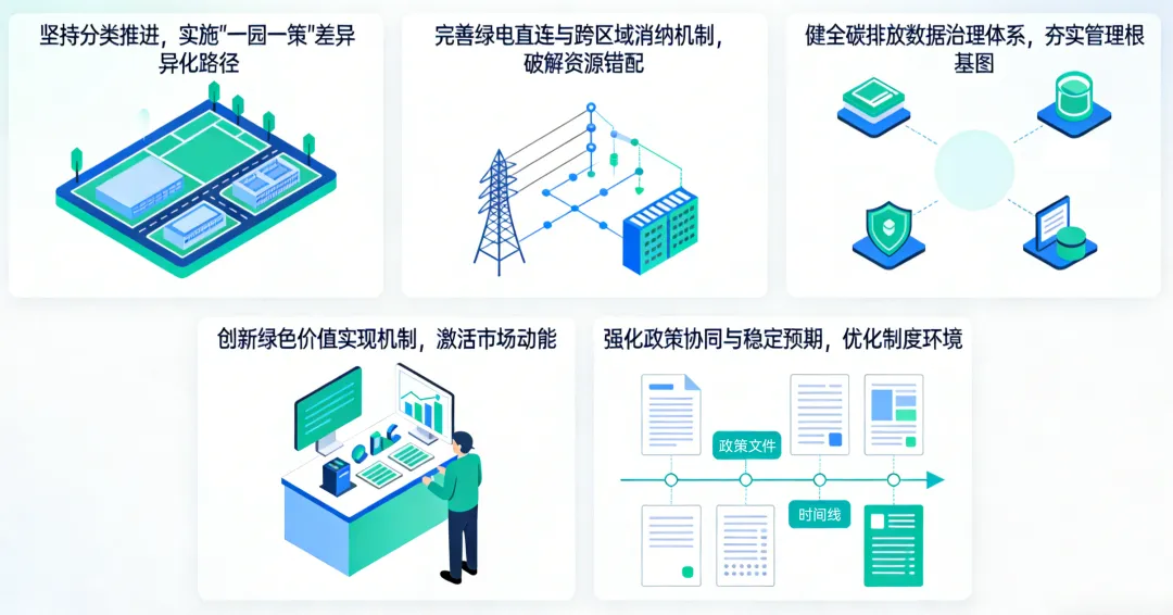 立足国内实践,借鉴国际经验,针对当前零碳园区建设面临的问题挑战,建议从分类推进、机制完善、数据治理、价值实现、政策协同五方面发力,破除瓶颈、打通堵点,为零碳园区规模化规范化建设提供有力支撑。