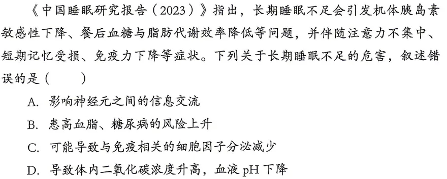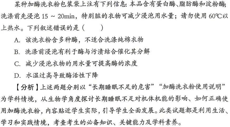 生活、学习和实践情境,是指考生日常生活中或社会实践中常见的生物学相关现象或问题。这类情境试题与考生实际生活最为贴近,可用来考查考生知识技能迁移的能力,考生对融入生活情境的学科知识觉得更加亲切,也更易理解,试题的难度也较低。