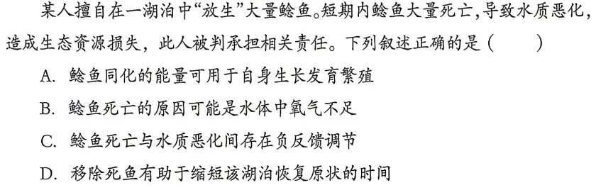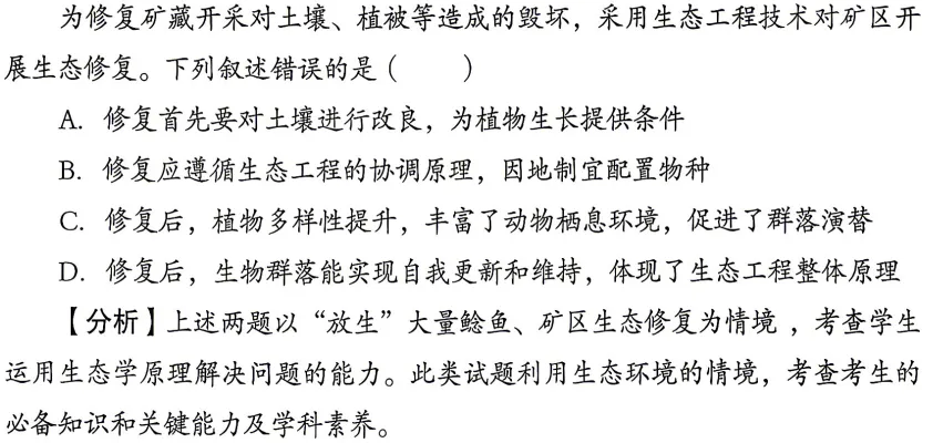生态环境情境,是指涉及生态系统组成、各成分的作用,生态系统物质循环、能量流动、信息传递的规律和特点等,多与环境资源、环境保护、天气与气候的变化等相关的情境。这类情境试题也贴近考生的实际生活,除考查考生有关生态环境的必备知识外,还考查学生理解能力、运用所学知识分析解决实际问题的能力,最终指向学科素养,使学生形成生态文明的观念。