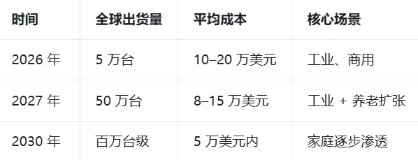 核心零部件国产化、规模化量产与供应链成熟,推动人形机器人成本进入断崖式下降通道。2026年整机成本仍处于10—20万美元区间,2027年随万台级交付落地将降至8—15万美元,2030年有望全面进入5万美元以内,达到消费级可接受区间,为家庭场景普及奠定基础。