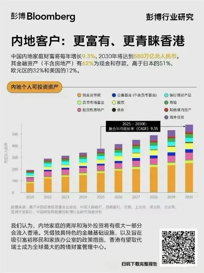 香港之所以能够登顶,最大的支撑来自背后的祖国。彭博报告预测,中国内地家庭的可投资资产正以每年9.3%的速度增长,预计到2030年将达到惊人的580万亿元人民币。