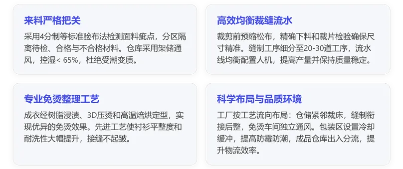 结论:综上,一个免烫衬衫全流程解决方案的成功实施,有赖于从前端材料管控到末端包装发运的全方位优化。在流程设计上,标准化的工艺流程和严密的质量管控应贯穿仓储、裁剪、缝制、免烫、包装各环节;在工序分配上,通过工业工程方法细分工序并均衡生产线,实现人机效率最大化且质量稳定;在工厂布局上,以物流最短和环境适宜为原则划分功能区,确保生产流转顺畅无瓶颈、产品存储安全无隐患。同时借鉴行业领先者的最佳实践(如先进的免烫整理技术、智能设备应用和精益管理),能够帮助我们进一步提升产能与品质,降低成本和次品率。在满足市场对免烫衬衫日益增长需求的同时,亦要注重绿色环保和员工安全,做到高质量与高标准并行。本研究报告希望为工厂规划和流程优化提供全面指引,助力企业打造具有竞争优势的免烫衬衫生产体系。