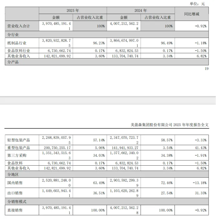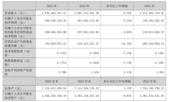 2025年,面对国内市场阶段性承压的外部环境,美盈森整体经营保持稳健。全年实现营业收入39.70亿元,同比微降0.92%;归属于上市公司股东的净利润2.61亿元,扣除非经常性损益后的净利润2.69亿元,经营活动产生的现金流量净额3.71亿元,现金流状况依旧健康。