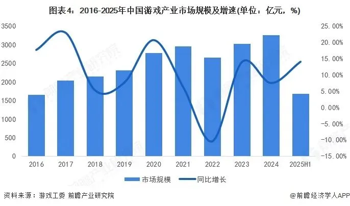 我国游戏市场规模呈现反弹态势。根据游戏工委数据表明,2024年我国游戏产业市场规模已经突破3257.8亿元,同比增长7.53%,约占全球游戏市场的26.7%。2020-2022年我国游戏行业出现短暂下滑,从2020年正增长20.71%到2022年负增长10.33%,出现自2008年以来的首次负增长。但2022年后我国游戏市场规模迅速反弹,年增速达7%以上,至2025上半年我国游戏市场规模为1680亿元,同比增长14.08%。